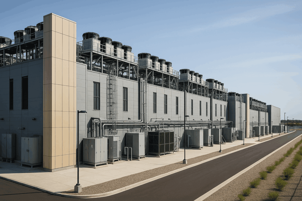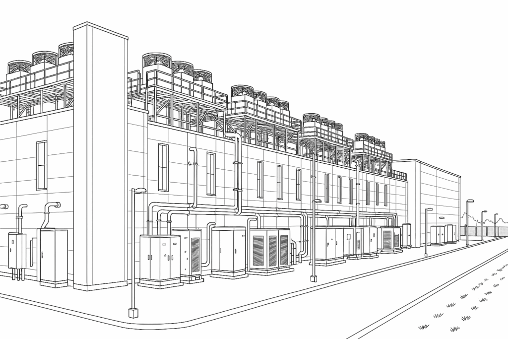 Ved siden af hallerne står nødstrømsgeneratorer, typisk enorme dieselmotorer, klar til at tage over, hvis elnettet svigter. Bag dem ligger køletårne og varmevekslere, som enten leder varmen væk i luften eller sender den videre til et fjernvarmenet.