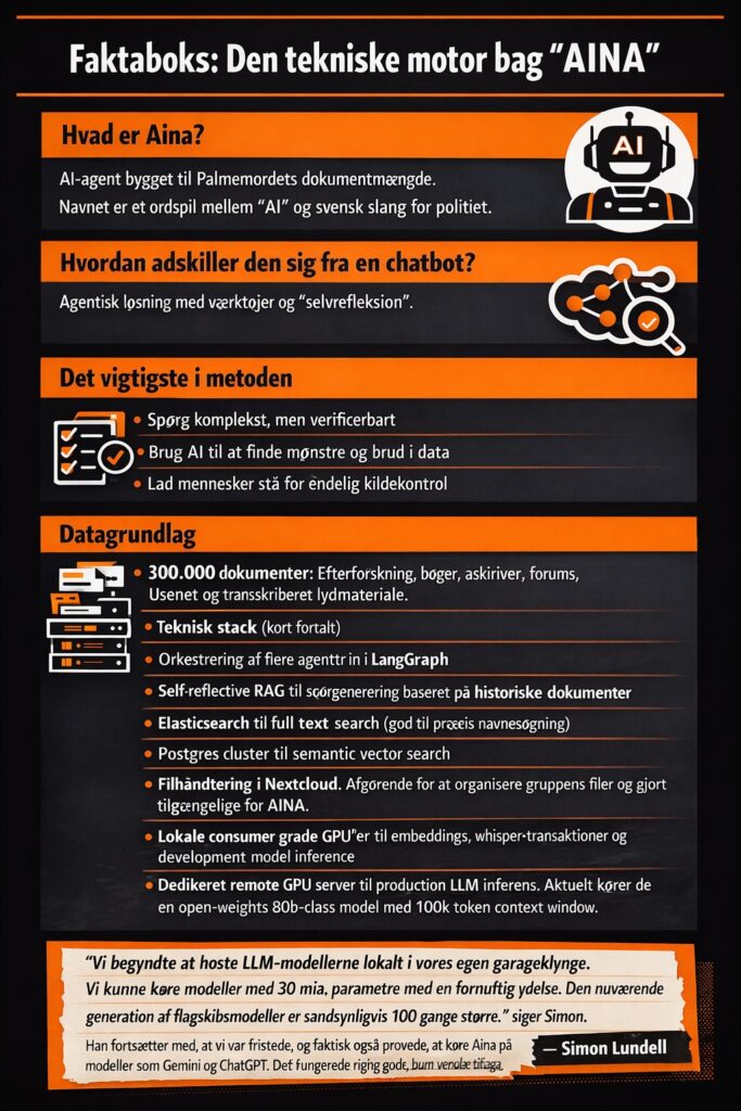 AINA’s svar i situationen er nøgternt — i retning af, at Palmemordet fortsat er en uopklaret forbrydelse. Og det er præcis Lundells pointe: Værdien ligger ikke i, at AI udpeger en gerningsmand, men i at den kan bruges til at teste delspørgsmål systematisk. For ham er metoden vigtigere end det dramatiske svar: spørgsmål, der kan verificeres eller falsificeres, frem for spørgsmål, der inviterer til store fortællinger.
