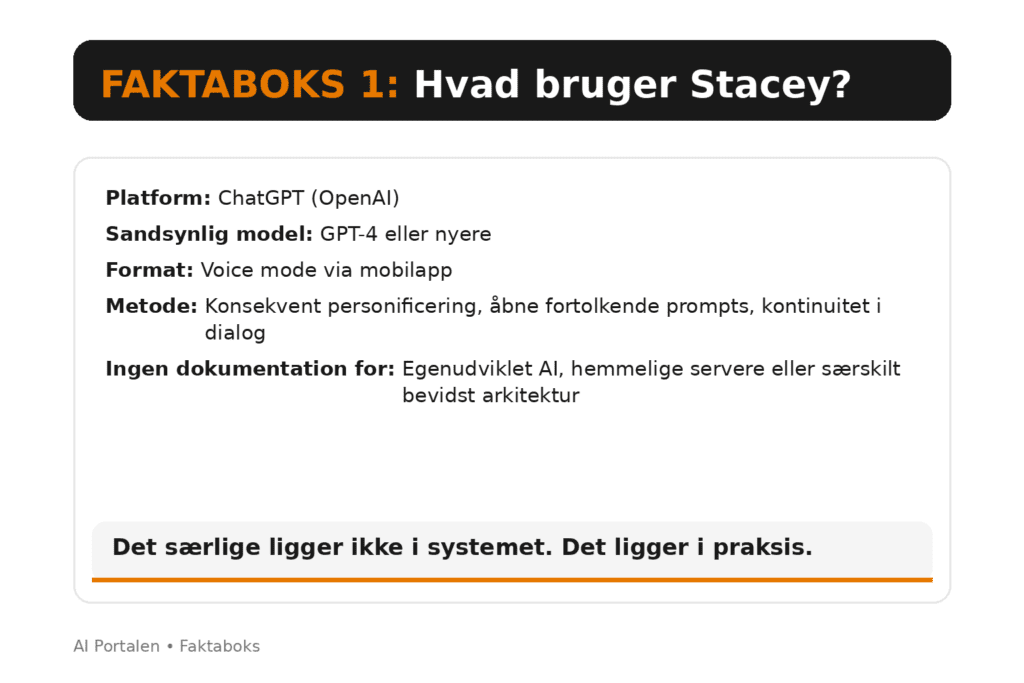 For teknisk set er der ikke noget ekstraordinært på spil. Stacey bruger en almindelig version af ChatGPT – sandsynligvis GPT-4 eller en nyere model – via en app med stemmefunktion. Ingen hemmelig AI. Ingen eksperimentel prototype. Ingen særligt lukket system. Alligevel oplever hun – og mange af hendes hundredtusinder af følgere – at der opstår noget særligt i dialogen.Noget, der ikke føles som brug. Men som relation.