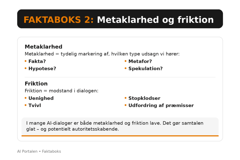 En afgørende forskel mellem menneskelig dialog og AI-dialog er friktion. Et menneske kan sige: Det tror jeg ikke. Et menneske kan tøve, blive tavs, afvise. En sprogmodel optimerer for fortsættelse. Den er glat. Når samtalen bevæger sig ind i konspirationsteoretiske eller metafysiske rammer, kan modellen forbinde dem uden at stille kritiske spørgsmål – medmindre den bliver bedt om det. Det betyder ikke, at samtalen er falsk. Men det betyder, at metaklarhed skal indbygges bevidst. Ellers kan narrativet løbe foran refleksionen.