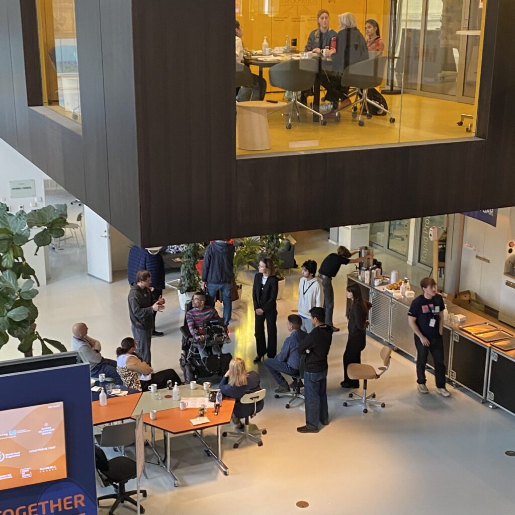 På DTU Skylab dagen efter er energien en anden. Her er mindre oplæg og mere bevægelse. Dagen begynder med kaffe og morgenmad i det, der både er undervisningslokale og et lille køkken omgivet af værksteder, hvor design bliver til virkelighed. Hvor studerende til dagligt udvikler nye løsninger til mere effektiv madproduktion, til vandrensningsløsninger, der er økonomisk tilgængelige for dem, der har brug for dem og programmer til virtuel tilgængeligheds gennemgange af lokaler inden de bygges eller bygges om.
