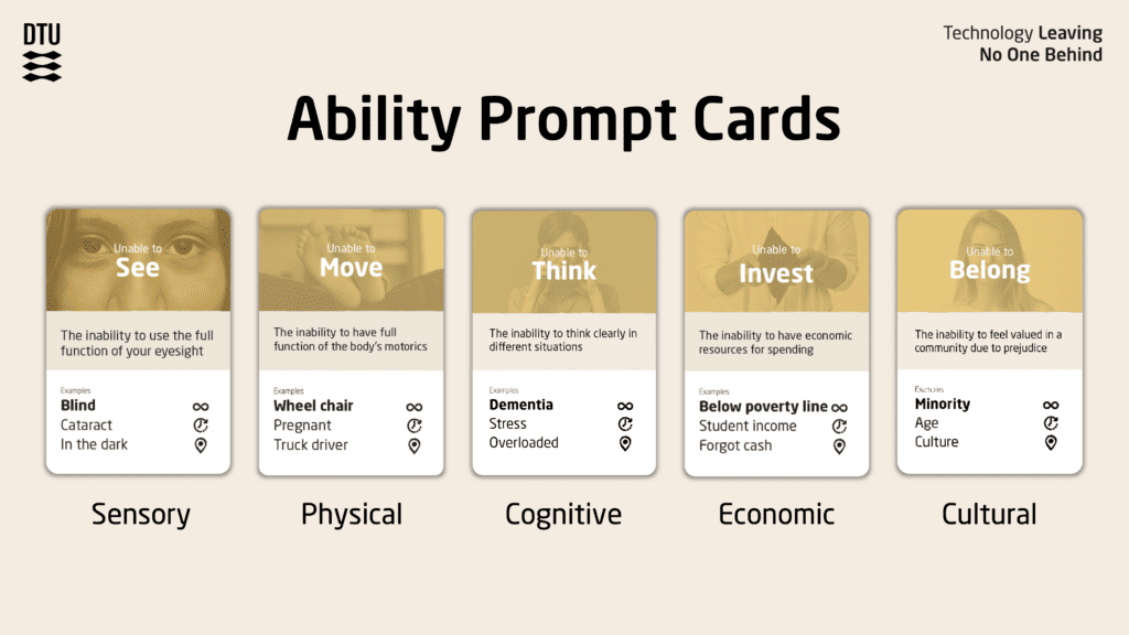 Der ligger også Ability Prompt Cards fra DTU Skylab. Små kort, der skubber deltagerne væk fra den forestillede gennemsnitsbruger og over mod et mere krævende spørgsmål: “Who are you currently excluding?” Kortene beder teams om at teste deres idéer mod forskellige former for variation og friktion — ikke kun permanent funktionsnedsættelse, men også midlertidige og situationsbestemte barrierer.