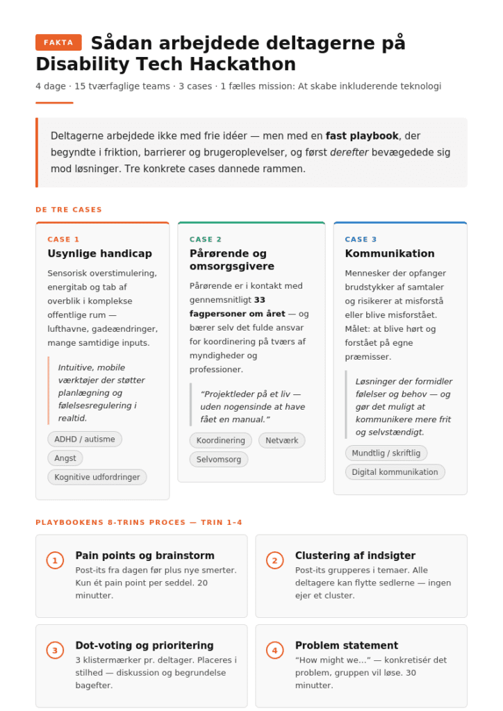 For når man lytter til den måde, hackathonet bliver sat op på, er det tydeligt, at det ikke bare handler om at finde på smarte løsninger. Det handler om at vende udviklingsprocessen om. Først forstå problemet. Først høre erfaringerne. Først se verden fra det sted, hvor teknologien plejer at slå fejl.