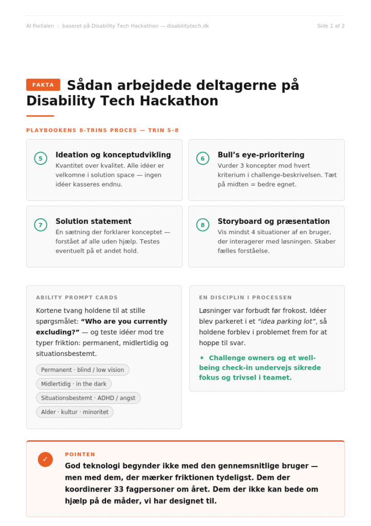 Disability Tech Hackathon giver ikke noget endeligt svar. Men det viser, at når man lader udviklingen begynde med erfaring, med handicap, med friktion og med dem, der normalt først bliver hørt bagefter, så forandrer selve innovationen karakter. Ikke nødvendigvis fordi løsningerne bliver perfekte. Men fordi teknologien for en gangs skyld bliver tvunget til at blive mere menneskelig.